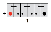Terminal Layout: Positive (+) on left,  Negative (-) on right ; with the terminals on the edge of the battery closest to you